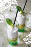 Pour servir, mettre une couche de banane, un trait de sirop de banane verte (ça ajoute un peu d'acidulé) puis remplissez avec l'espuma de coco. Décorez avec une petite feuille de menthe, quelques zestes de citron vert et un morceau de gousse de vanille.