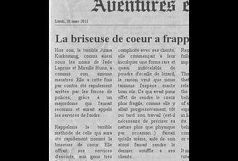 Hier soir, le terrible Anna Kurkoming, connu aussi sous les noms de Jade Laproie et Mireille Huns, a commis son sixième meurtres. Elle a cette fois par contre été rapidement arrêtée par les forces de polices, grâce à un majordome qui l’aurait reconnu et aurait appelé les services de l’ordre.