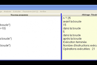 Il présente côte à côte le texte d'un mini programme rédigé avec une syntaxe très simplifiée utilisant des mots français et le texte résultant de l'exécution de ce mini programme. Cette exécution peut être demandée pas à pas.