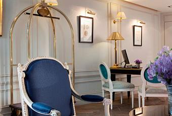 Chacune des 24 chambres de l’hôtel est conçue tel un boudoir avec son lit à baldaquin, ses bergères et ses gravures, ou encore ses moquettes moelleuses. On craque pour les poignées de porte en laiton vieilli, ou pour les interrupteurs à l’ancienne. Toutes les chambres sont habillées de tissus signés Brunshwig & Fils, avec trois thèmes prédominants : l’exotisme du Japon et de la Compagnie des Indes, la nature et le fameux Bleu Céleste.