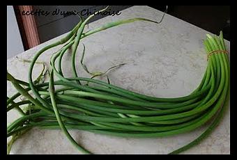 Pour 2 personnes:Ingrédients: 300 g de pousses d'ail, 3 oeufs, 2.5 c. à soupe d'huile végétale, 1 c. à soupe de sauce de soja, 1 c. à café de vin jaune, 3 tranches de gingembre, sel et poivre.