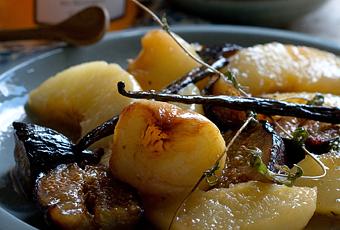 Pour la poêlée de figues et pêches 4 figues violettes / 3 pêches plates / 2 c. s. de miel / quelques morceaux de bleu de Causses / 5 noix concassées / 1 gousse de vanille / quelques branches de thym citron frais / 1 c. s. d'huile d'oliveRincer les figues, les couper en morceaux. Éplucher les pêches et les diviser en trois. Faire chauffer l'huile d'olive, le miel, la gousse de vanille et le thym jusqu'à obtenir un léger frémissement, à la manière d'un caramel. Y faire revenir les morceaux de fruits à feu moyen, quelques minutes de chaque côté, afin de les faire rôtir. Verser dans une assiette, émietter le bleu de Causses et parsemer de noix concassées.