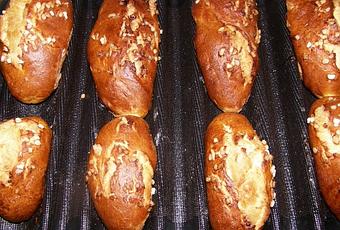 Quand le programme est terminé sortez le pâton et divisez en petits pains travaillez-les et disposez-les sur une plaque à baguette , couvrez-les et laissez lever le temps que le four chauffe à 210° , badigeonnez-les d'oeuf et parsemez de sucre perlé et mettez au four sans oublié de mettre de l'eau dans la lèche frite , laissez cuire 15 à 220min.