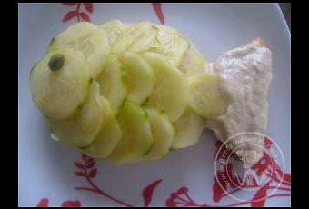 Dans une assiette, placer le pain, recouvrir de crème de maquereau et poser les écailles de concombre dessus en commençant par la queue. Superposer les concombres.