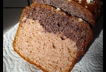 Allumer le four à 180°C.Beurre généreusement un moule à cake, le fariner.Dans deux saladiers différents, préparer une portion de pâte composée d'un œuf, 60 gr de sucre, 10 cl de lait, 2 cuillères à soupe d'huile, la poudre de fruit. Mélanger au fouet. Ajouter 150 gr de farine et 1,5 cuillerée à café de levure.Verser la pâte framboisée dans le moule, puis couvrir avec la pâte myrtillée. Plonger un pic à brochettes dans la pâte en faisant de larges zigzags (sans touiller, mais en soulevant quand même un peu les pâtes de bas en haut).Décorer de sucre en grain ou de décors en sucre, et enfourner pour 35 minutes environ (vérifier en plongeant un pic à brochette en bois dans la pâte, il doit ressortir sec).Démouler à la sortie du four et faire refroidir sur une grille.