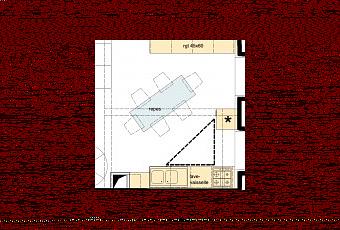 Idéal pour aménager une cuisine ouverte. Le triangle d’activité est généralement bien optimise. La table peut être aménagée en bar.