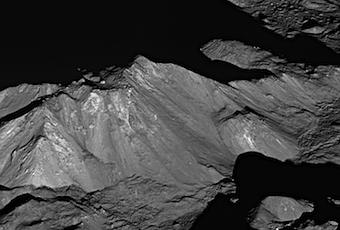 Sur les images présentées ci-dessus et ci-contre (voir et revoir aussi la vidéo), on peut admirer comme jamais auparavant, le python central. Son sommet s’élève à 2 000 mètres au-dessus du fond du gigantesque cratère. Lors du violent impact d’un probable astéroïde, la partie centrale, par rebond, s’est vraisemblablement dressée puis refroidie. La caméra de LRO a même photographiée un rocher solitaire de 120 mètres de large, se tenant au sommet du pic !