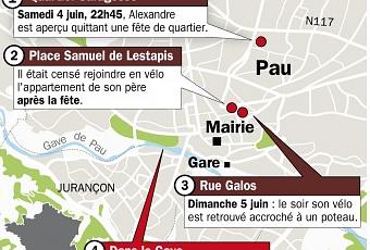 Le 4 juin, A a disparu aux alentours de 23h. Plus précisément, il est enregistré par une caméra de surveillance alors qu’il est sur son vélo à 22h51 au niveau de la Poste rue Carnot, à Pau. Sa destination se trouve 200m plus loin à peine, place Samuel de Lestapis. Pour s’y rendre, il croise donc, dans le prolongement de la rue Carnot, la rue Raymond Planté sur sa droite, débouche sur le carrefour place de la République où le plus court voudrait qu’il oblique à gauche. S’il continue tout droit, il croise ensuite la rue Galos où il peut également prendre à gauche. Le quartier est commerçant, à vue d’œil aucun bar ou aucun restaurant ouvert à une heure pareille, même un samedi soir.