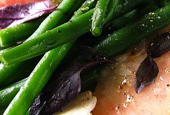 Il me restait des pêches blanches de la dernière fois et j'avais trouvé de jolis haricots verts extrafins ainsi que des amandes fraîches. Le basilic pourpre planté il y a quelques semaines sur le bord de la fenêtre en prévision de certaines de ces recettes était prêt à être cueilli.