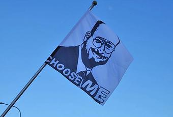 Matthieu Vertut alias Président Vertut prend ses quartiers sur le Pont du Mont-Blanc. Depuis le début de ce mois, le lauréat du Prix du Quartier des Bains version 2011 décore le pont le plus fréquenté du Canton avec 24 drapeaux identiques représentant un homme barbu vraisemblablement l’auteur avec des lunettes et la mention: “Choose me”.