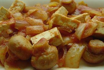 3° Coupez le tofu en lamelles. Une fois que les oignons revenus, versez le tofu dans votre poêle. Laissez dorer.