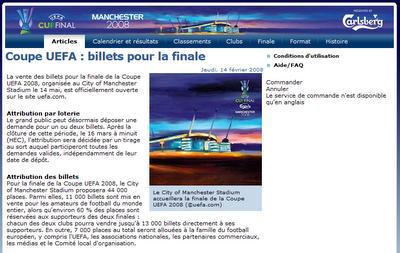 La finale de la Coupe de l'UEFA se tiendra à Manchester le 14 mai prochain, et il est désormais possible de commander un ou deux billets par personne sur le site de l'UEFA, pour des places allant de 47 à 127 euros. A noter que l'attribution des 11 000 tickets proposés au grand public se fera par tirage au sort entre le 16 et le 25 mars prochain.