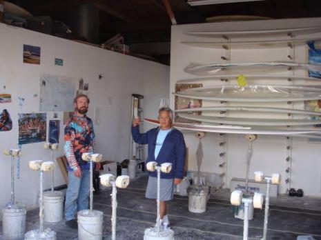 Visite de l'atelier de strate à 20 min de là c'est Donald qui a pris le control de ma caisse , arrivé làbas , trop impressionnant , 3 glassrooms de 10 à 12 stands chaque , que du longboards High Class , de la tint , glasson fin , Gloss , Volan .. Ils font environs 2000 top boards / an , 60 % part pour le Japon !