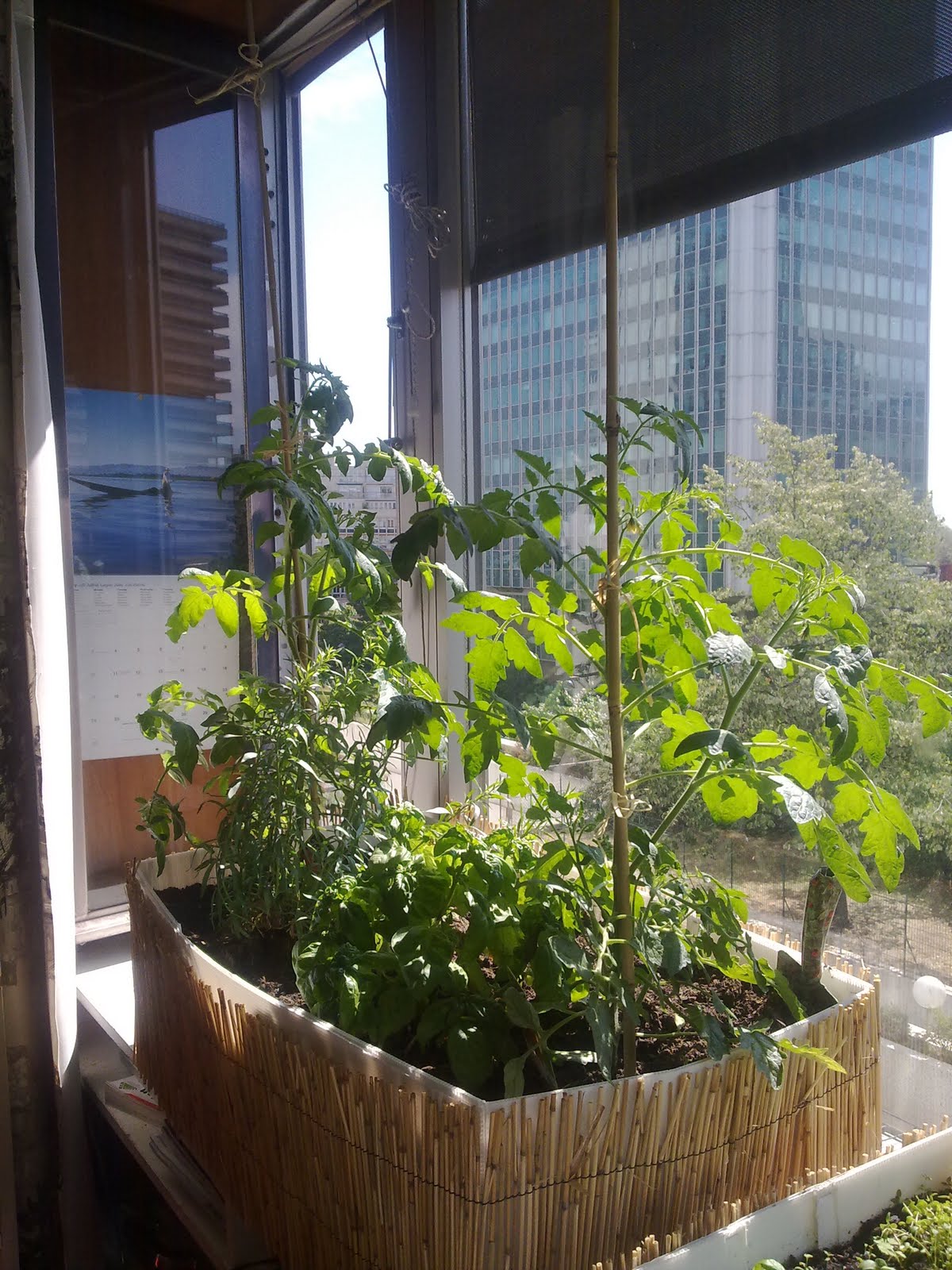 Maintenant le bac à tomates&Co :Comme vous pouvez le constater, en 8 jours les pieds de tomates "Saint Pierre" ont encore pris une belle ampleur. J'ai commencé à consolider les tuteurs sur les conseils de beau-papa, jardinier-potager naturel de Gironde... "Attends, t'imagine avec 3-4kg de tomates par pied" ? Non j'imagine pas encore, mais je ne demande qu'à le voir... !