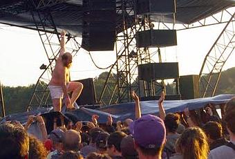 En 2010, le vendredi des Eurockéennes proposait une concentration impressionnante de bons artistes. Cette année c'était beaucoup plus light mais nous avons tout de même trouvé de quoi nous occuper. La faute au camping qui n'ouvrait que le jour même au lieu du jeudi les années précédentes nous arrivons dans l'enceinte du festival vers 20h seulement et allons à la plage voir les Savy Fav en guise d'échauffement musclé. Voir un chanteur à grosse bedaine et avec pour seul vêtement un caleçon douteux est un peu traumatisant mais quand même sacrément rock'n'roll. Le barbu déborde d'imagination quand il s'agit d'utiliser des accessoires pour égayer le set. Voir dessin ci-dessous :Sinon niveau musique on ne se rappelle pas trop mais on pense que c'était bien.