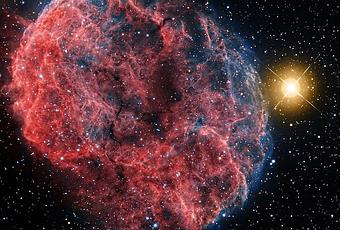 Ce fabuleux objet céleste ne cesse d’enfler à environ 5 000 années-lumière de nous, dans la constellation des Gémeaux (Gemini). L’étoile dorée qui brille à ses côtés représente l’un des pieds du célèbre Castor, l’un des deux frères jumeaux de la mythologie greco-romaine.
