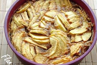 Répartir la moitié des pommes dans le fond d'un moule à manqué. Verser le flan par dessus. Répartir le restant des pommes en rosace sur la crème.