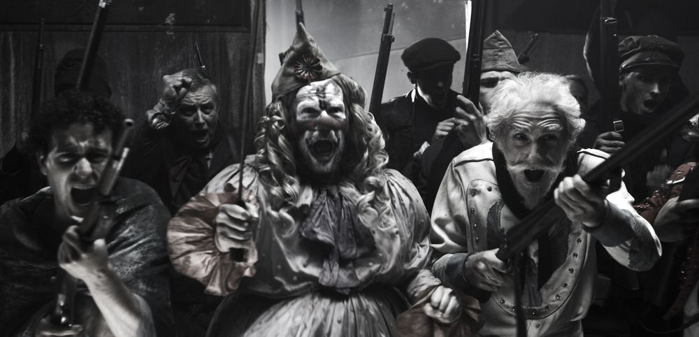 Balada Triste, le dixième film d’Alex de la Iglesia, est un objet protéiforme et torturé, à la fois aisément abordable et infiniment complexe, mêlant la grande histoire et la petite dans un puzzle en mouvement permanent. Pour prévenir cet enchevêtrement de paradoxes, de degrés de lectures qui s’emboîtent les uns dans les autres tout en se contrant, le cinéaste espagnol choisit d’ouvrir son film sur une scène limpide et admirablement programmatique, suivie d’un générique lardé d’indices.En pleine guerre civile espagnole, deux clowns amusent un public d’enfants, qui l’espace de quelques instants oublient qu’au dehors, le pays se déchire. Et lorsque la réalité se rappelle à l’univers fictif et frappe à sa porte, lorsque les bombardements se font sentir jusqu’à l’intérieur du chapiteau, les clowns n’hésitent pas et redoublent d’inventivité pour faire oublier le danger imminent. De la Iglesia consacre ainsi, en une poignée de minutes, le règne de l’imaginaire et de la comédie comme remparts face aux impératifs du réel. Puis la scène se poursuit, les soldats vont jusqu’à s’immiscer dans le temple du burlesque, et extraient les clowns de leur univers pour les réquisitionner au service du combat républicain. Lorsqu’après quelques réticences l’un d’entre eux demande s’il a besoin de se changer, le leader des troupes armées lui répond que sa tenue, au contraire, effraiera les franquistes. Quelques instants plus tard, le clown aura en effet décimé, presque à lui tout seul, un régiment entier avant d’être maîtrisé.