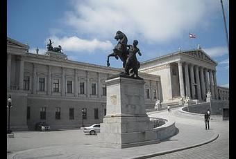 L'intérieur célèbre aussi le style grec antique, avec des salles comme celle-ci, qui est inspirée de temples grecs et qui est entièrement réalisée en marbre. On retrouve également un vestibule dans lequel trônent douze statues de dieux grecs. L'ensemble n'est pas un hommage, mais plus un énoncé; cet édifice est un berceau de la démocratie, en Autriche.