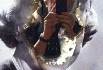 yeux crevés devenus reflets, les visages aveugles perdant toute expression, le vertige qui nous gagnait à contempler ces yeux vides. Mais les portraits présentés ici vont bien au-delà. Ce n’est plus simplement le regard qui est oblitéré, mais ce sont des pans entiers du visage qui ont été brûlés, mutilés ; la peau/papier a été arrachée, les trous oculaires mangent la face. Les personnages ainsi défigurés, gueules cassées d’aujourd’hui, sont des acteurs célèbres, de ceux que, dans ma génération, on punaisait aux murs d’une chambre d’adolescent(e) : on s’efforce de deviner leur identité avant de lire le cartel, de reconnaître tel détail, telle coiffure crantée, tel maxillaire arrogant. Mais le geste sacrilège de destruction d’un visage est aussi une re-création : dans les zones lacunaires du portrait de la star détruite apparaît le miroir, et dans ces bouts de miroir apparaît le nouvel héros, le spectateur. Photographiant l’œuvre, j’y apparais (délibérément), m’incluant dans ces