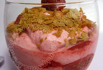 Préparez ensuite la mousse : mixez 300g de framboises avec 125g de sucre, passez éventuellement au tamis (ce que j’ai fais). A l’aide d’un batteur électrique, fouettez la crème en chantilly dans le saladier sorti du réfrigérateur. Mélangez la petit à petit avec la purée de framboises. Montez les blancs en neige avec la pincée de sel, pendant 2 minutes. Ajoutez progressivement le reste du sucre en continuant à battre jusqu’à ce que les blancs soient bien fermes. Incorporez délicatement à la chantilly aux framboises. Répartissez cette mousse ainsi que le coulis dans de jolis verres en y rajoutant quelques framboises réservées. Filmez et placez 5 heures au congélateur.