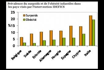 Augmentation du tour de taille du Nord au Sud: L'étude montre qu'environ 1 enfant sur 5 est en surpoids ou obèse. D'une manière générale, et partout en Europe, le surpoids chez les enfants de moins de 10 ans concerne davantage les filles que les garçons. Parmi les différents pays visés par les interventions de l'étude IDEFICS, la prévalence de l'obésité infantile s'avère plus élevée dans les pays du Sud de l'Europe (jusqu'à 20 %) que dans les pays du Nord (moins de 5 %). Une conclusion en ligne avec une fréquence plus élevée de repas pris en regardant la télévision dans les pays du Sud de l'Europe comparée à ceux du Nord.