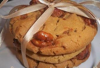 J ai encore utilisé des cacahuètes caramélisées (c'est trop bon!!) mais cette fois dans des cookies au beurre de cacahuètes. Miam-miam!!!