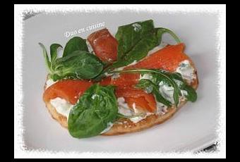 Les sortir du four, les tartiner de tzatziki et répartir dessus le saumon et la salade verte.