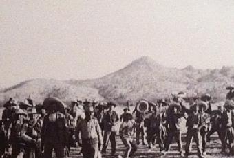 De ce point de vue, ma photographie préférée est celle-ci-dessus prise par le nord-américain Jimmy Hare (dont le travail a été récemment redécouvert, permettant un éclairage autre sur la révolution) : nous sommes sur le Rio Bravo, fleuve frontière, c'est-à-dire que le photographe est aux USA (et donc, implicitement, nous, les spectateurs, y sommes aussi), alors que les guerriers madéristes, eux, sont au Mexique, au Sud, en face, dans cet autre monde. Quarante ans plus tôt, il y eut aussi une guerre civile au Nord, mais en 1910, les Etats-Unis post guerre de Sécession sont un pays civilisé, policé, alors que le Mexique est encore englué dans les troubles inquiétants du Sud : la fracture est bien là. Mais ces combattants qui prennent des poses théâtrales devant cette toile de fond, ce décor du paysage mexicain se reflètent dans l’eau du fleuve, et ces reflets glissent vers nous, s’infiltrent dans notre monde, nous métissent.