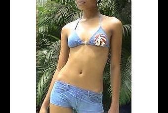 Le haut de forme triangle se noue dans le cou, le bas est un mini-short avec des passants permettant d’y glisser un foulard ou une ceinture pour un look 100% tendance.