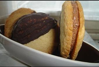 - Préchauffer le four à 200°CSortez la pâte du frigo et former un rouleau de 5 à 7 cm de diamètre.Découper des tranches de pâte de 1 cm d'épaisseur en nombre paire.faire cuire 12 minutes puis laissez refroidir complètement.