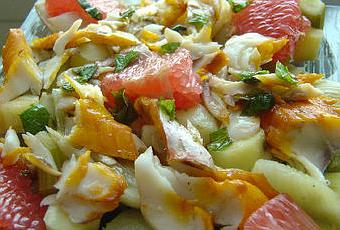 6° Préparez la sauce-vinaigrette : mélangez l'huile d'olive, le jus du pamplemousse, la ciboulette ou le basilic ciselés. Salez et poivrez.