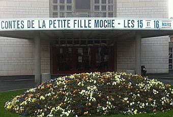 En attendant la reprise en mars 2012, je suis retombé sur une photo de la tournée de cette année : le théâtre municipal de St-Lô avec sa façade lumineuse où s'étalent fièrement les lettres qui composent le titre du spectacle :