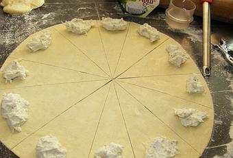 Etalez votre pâte feuilletée au rouleau farinez-ma avec une roulette coupez en 12 parts mouillez au centre sur les pointes avec de l'eau .