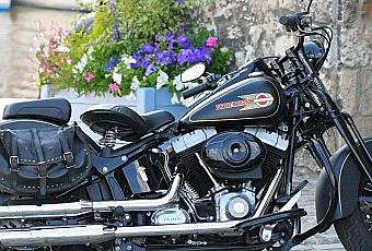 La bête est magnifique garée sur le port d’Honfleur. Une fourche Springer, dans le style d'avant guerre, Selle monoplace à ressorts pour donner la réplique