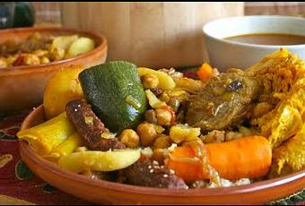 - ajoutez ensuite les viandes par ordre de cuisson: d'abord le boeuf puis1/2 heure après l'agneau et 1/2 heure avant la fin de la cuisson du couscous, le poulet