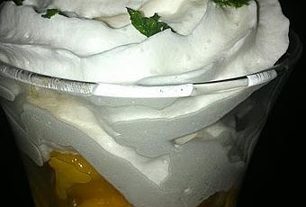 Placer les cubes de mangue et d'orange dans votre verrine et surmonter le tout de la mousse à la noix de coco. Parsemer la de quelques feuilles de menthe ciselées.