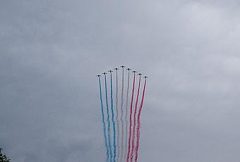 - Sinon, trouver un point haut ou dégagé… et si possible dans l’axe des avions. Le Rdv idéal est donc la Défense… les avions sont déjà dans l’axe des champs, la patrouille de France commence déjà à diffuser sa fumée bleu blanc rouge… et il n’y a pas grand monde (mis à part quelques photographes)