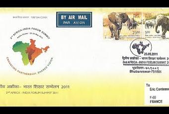 A noter l'emblème de ce sommet à gauche sur l'enveloppe (deux cartes de l'Inde et de l'Afrique aux couleurs du drapeau indien) accompagné du slogan "Un partenariat renforcé, une vision partagée"...A travers ce sommet, l'Inde cherche en fait à rattraper son retard par rapport à la Chine concernant les investissements en Afrique.