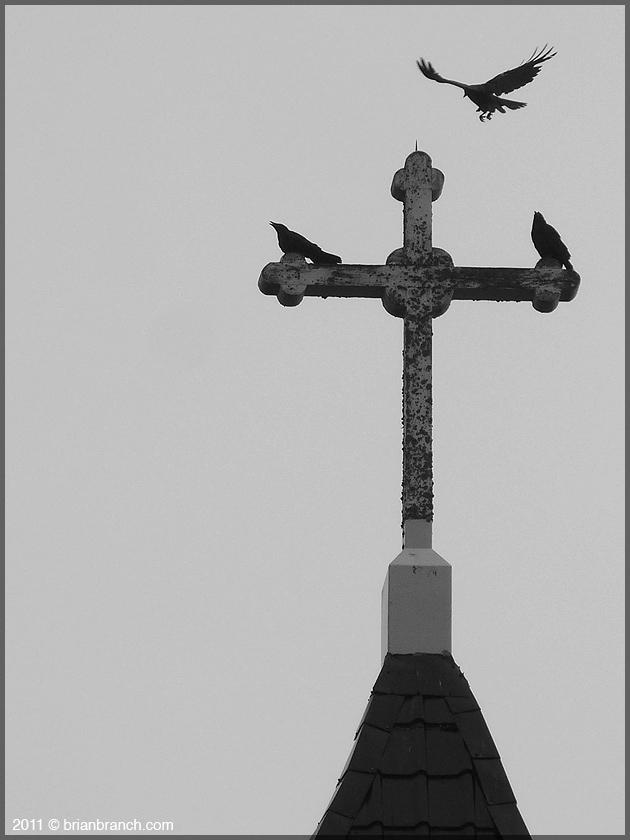 At exactly 2/3 of the image length-wise and 1/3 of the image height-wise: The center of the cross. The 1/3 of the birds flying is a bonus. Maybe a gift from above.À exactement 2/3 de l’image sur la largeur et à 1/3 de l’image sur la hauteur : le centre de la croix. Le 1/3 des oiseaux au vol: un cadeau du ciel. Peut-être un cadeau du ciel.