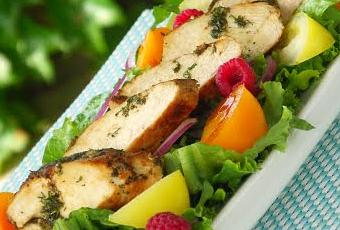 6)Répartir la laitue, l'oignon, les tomates, les pistaches et les framboises dans les assiettes. Garnir de tranches de poulet et napper avec la vinaigrette réservée.