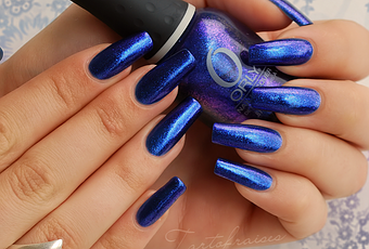 Voici un vernis plus que magnifique, c'est officiel, c'est mon bleu foncé préféré !! Il fait partit de la collection Cosmic FX d'Orly, c'est un duochrome (même triochrome !) composé de micro flakies aux reflets bleus / tuquoises / violets. L'application est top, le vernis bien fluide, le séchage assez rapide, par contre petit bémol sur l'opacité, comme les autres de la collection, il faut 3 couches. Comment résister !?!