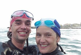 Nous nageons jusqu’ à la dernière bouée du chenal qui se trouve à 300m de la côte, je reste bien à coté de Virginie, pour elle se s’est une grande 1ère, je lui explique qu’il faut être la plus zen possible, les mouvements doivent être lent et il faut bien souffler dans l’eau afin de ne pas perdre son souffle. La natation en eau libre est un peu déstabilisant lorsque l’on débute, on peut vite s’essouffler.