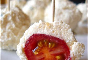 - Attention de ne pas mettre une couche trop épaisse sur les tomates, sinon les bouchées sont vraiment trop grosses pour être mangées en une fois. Selon la taille de vos tomates, vous pouvez les servir déjà coupées en deux, de manière à en faire des petites bouchées.