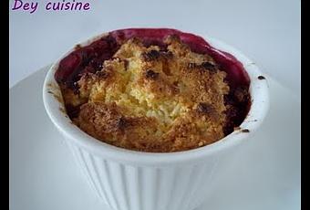 Pour 3 personnes (recette inspirée d'ici):Poêlée de fruits: 20g de beurre, 225g de prunes rouges dénoyautées, 50g framboises, 50g myrtilles, 20g de sucrePâte à cobbler: 110g de farine, 40g de polenta (semoule de maïs), 1cc de levure chimique, 20g de sucre, 1 pincée de bicarbonate, 30g de beurre mou, 150g de crème liquide