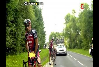 Que ce soit l’une ou l’autre méthode, ces images ne sont pas franchement « politiquement correctes » à la télé, alors le réalisateur du direct (Jean-Maurice Ooghe) doit jongler avec ses cameras pour que tous ces membres virils n’apparaissent pas à l’antenne. Et les coureurs ne lui facilitent pas la tâche ! Certes, ils repèrent la moto-camera qui les filment mais certains s’en moquent : ils ont envie de pisser et ils pisseront ! Les adeptes du « je pisse en roulant sur mon vélo » ralentissent sur le bord du peloton, baissent le cuissard, et se soulagent. C’est tout un art ! Tenir le guidon d’une main, et avec l’autre … Parfois, un de leurs coéquipiers maintient leur vélo pendant la miction ! Je vous dis : un vrai club uro le Tour de France !