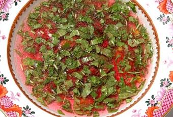 Mettre la garniture dans les assiettes, verser l’infusion glacée