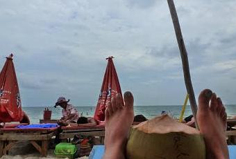 Sauf que là ce n'est pas sur le marché, mais sur la plage bordée de petits restos qui proposent des BBQ de fruits de mer pour 3 dollars et des transats qu'on peut squatter gratuitement à condition de consommer. Le premier jour, à peine installée, je me suis fait assaillir par une petite dame armée de son panier à tout faire. J'ai craqué pour une pédicure, me disant qu'ainsi, on me ficherait la paix par la suite... au moins sur ce point. Des ongles verts bien faits sont la parade à tous les « pedicure, lady ? ».