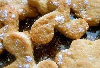 Former une boule. Laisser reposer 1/2 h dans un endroit frais. Etaler au rouleau sur 4 ou 5 mm. Découper des formes à l’emporte pièce. Enfourner à four chaud, 210° (Th 7°), cuire 15 mn