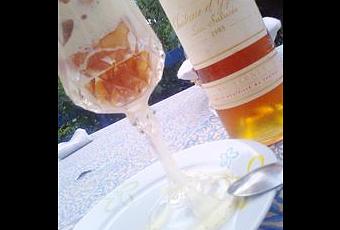 Le dessert est constitué d’un espuma de flan à la vanille parfumé de liqueur de mandarine sur des pêches de vigne au sirop de vanille. L’association avec Yquem a été tout à fait concluante, et même très séduisante en termes de texture et de saveurs.